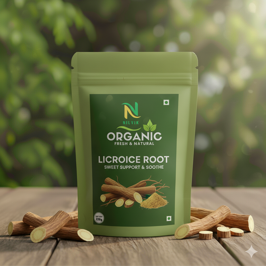 NilvikOrganic Licorice Root Powder is made from organically cultivated Glycyrrhiza glabra roots — carefully cleaned, dried, and powdered to retain its natural sweetness and therapeutic value. Traditionally known as “Mulethi,” licorice is widely used in Ayurveda for respiratory support, digestive health, and skin care. Its natural anti-inflammatory and antioxidant properties make it an excellent ingredient for herbal medicines and beauty products.