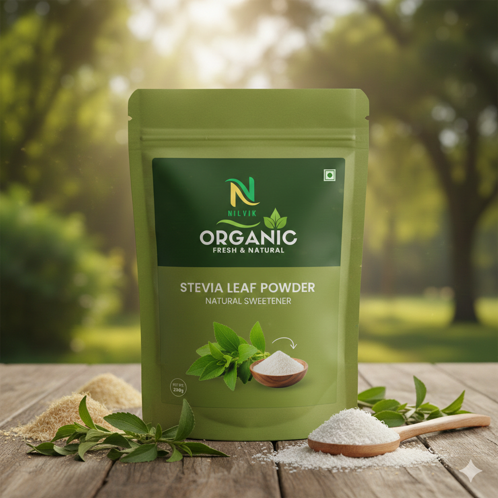 NilvikOrganic Stevia Leaf Powder is derived from organically grown Stevia rebaudiana leaves — a natural, zero-calorie sweetener that serves as a healthier alternative to sugar. Packed with natural sweetness and beneficial antioxidants, Stevia helps manage blood sugar levels, supports weight control, and promotes a balanced diet. It’s ideal for use in beverages, desserts, and health supplements.