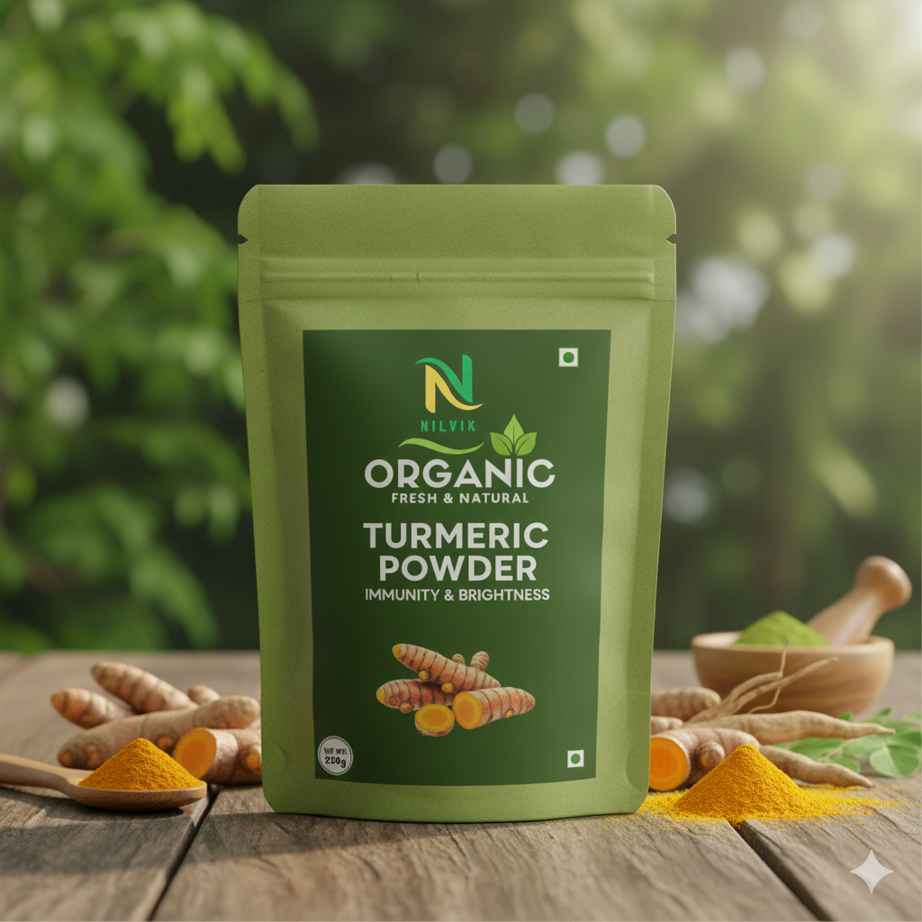 NilvikOrganic Turmeric Powder is made from premium-grade organic turmeric roots, carefully dried and ground to preserve its natural curcumin content. Known for its vibrant color and powerful healing properties, turmeric has been used in Ayurveda for centuries to promote health, vitality, and natural beauty. Our organically processed turmeric is perfect for culinary use, health blends, skincare, and wellness products.